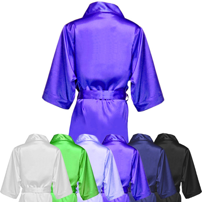 Легкий атласный халат для фитнес-бикини синего цвета с вашим именем на спине, набранным стразами. Идеально подходит для ожидания выхода на сцену или отдыха после выхода.