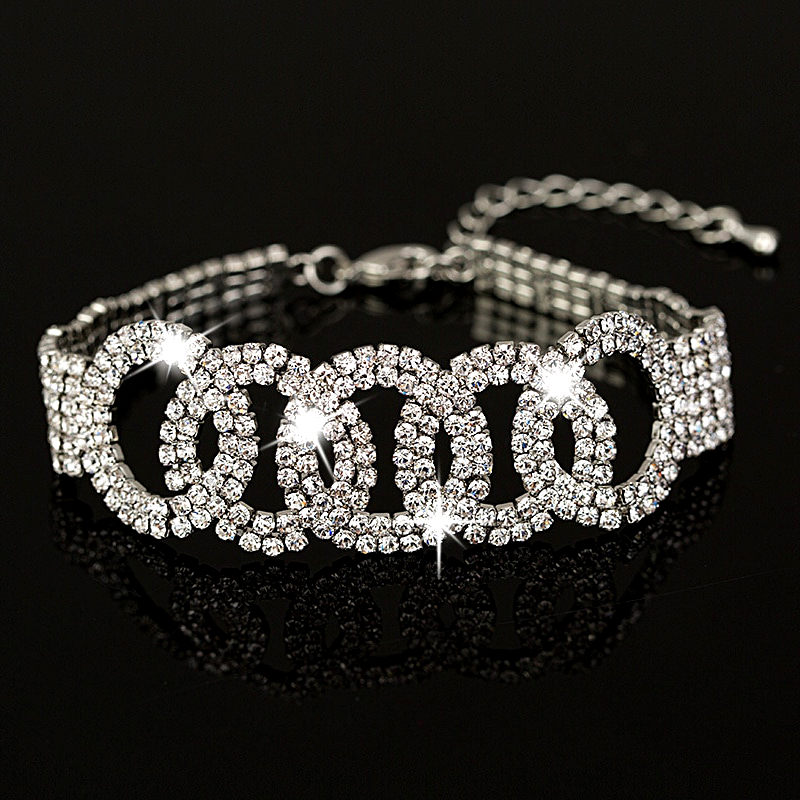 Браслет для фитнес-бикини со стразами в форме переплетенных между собой колец из страз. Максимальная ширина браслета – 3.5 см, длина – 19.8 см.