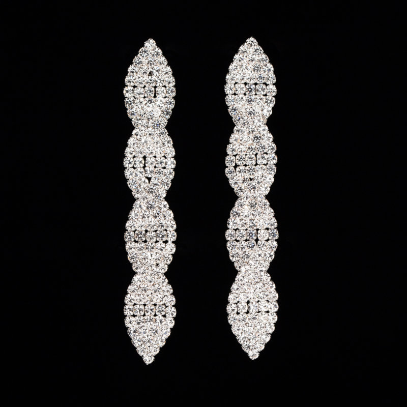 Серьги для фитнес-бикини со стразами «вьющейся» формы, где уложенные стразы изящно переплетаются между собой. Длина сережек – 7.2 см, ширина – 1.1 см.