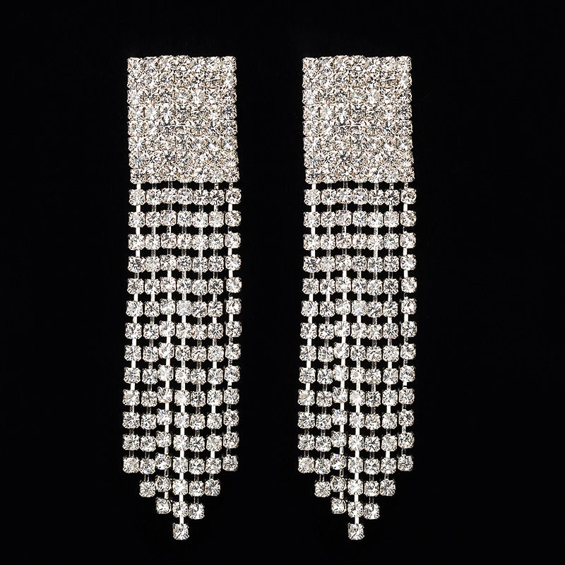 Серьги со стразами для фитнес-бикини оригинального, но несколько строгого дизайна. Верхняя часть оформлена плотным набором страз, формирующим квадрат, нижняя – в виде 7 струящихся нитей со стразами.